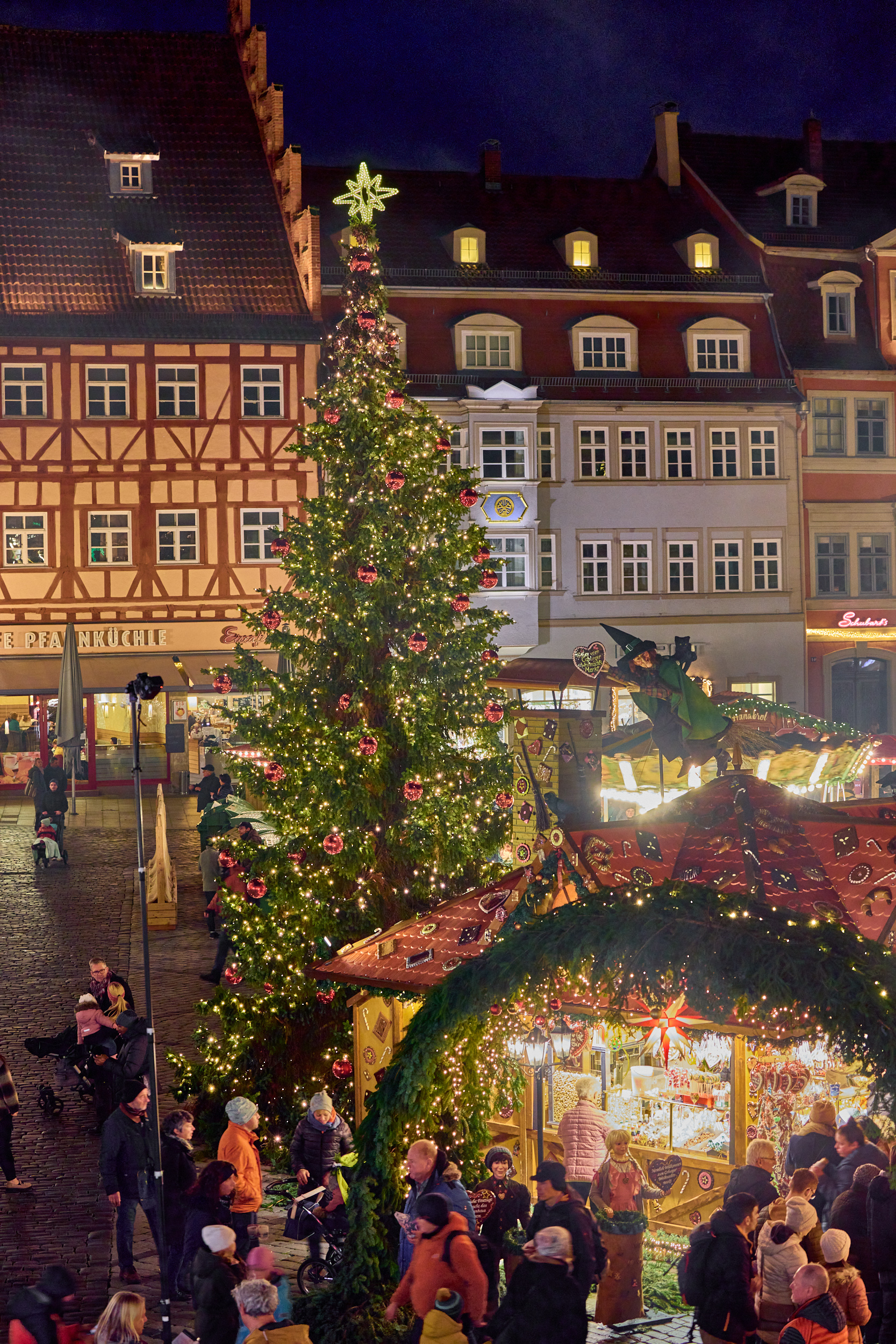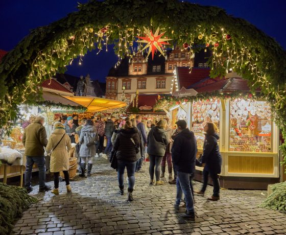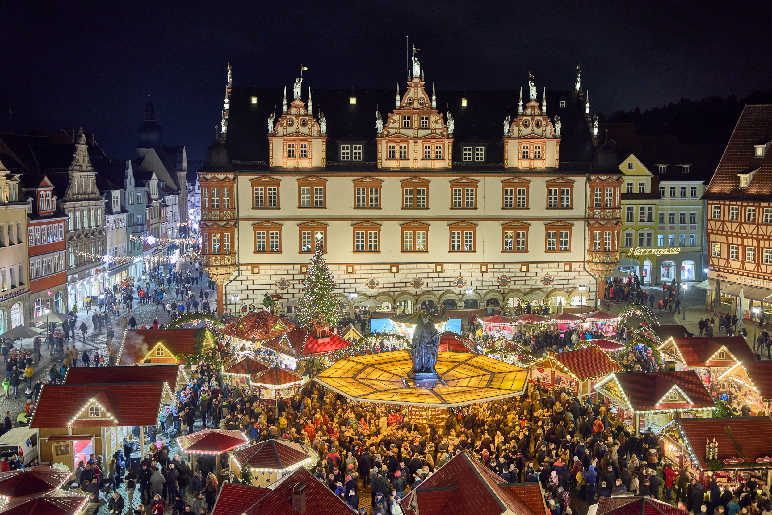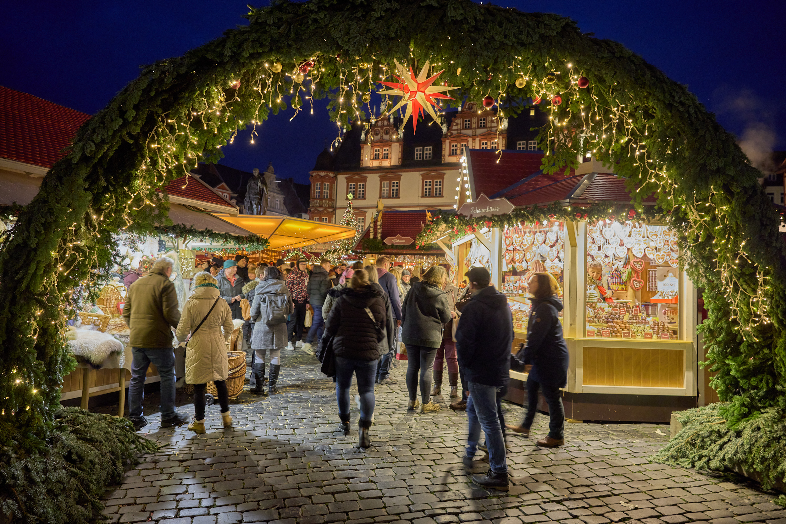Auf dem historischen Marktplatz zw. Rathaus und alten herzoglichen Kanzlei✶ gilt als Geheimtipp fernab von Menschenmassen und Großstadttrubel ✶ einer der Stimmungsvollsten in ganz Franken✶ kleine Weihnachtsstadt ✶ Budenzauber auf dem Marktplatz ✶ Glühwein & regionale Spezialitäten: Glühwein, Punsch, Deftiges, Süßes und Pikantes ✶ „Lichterhimmel“ rund um das Denkmal Prinz Albert
